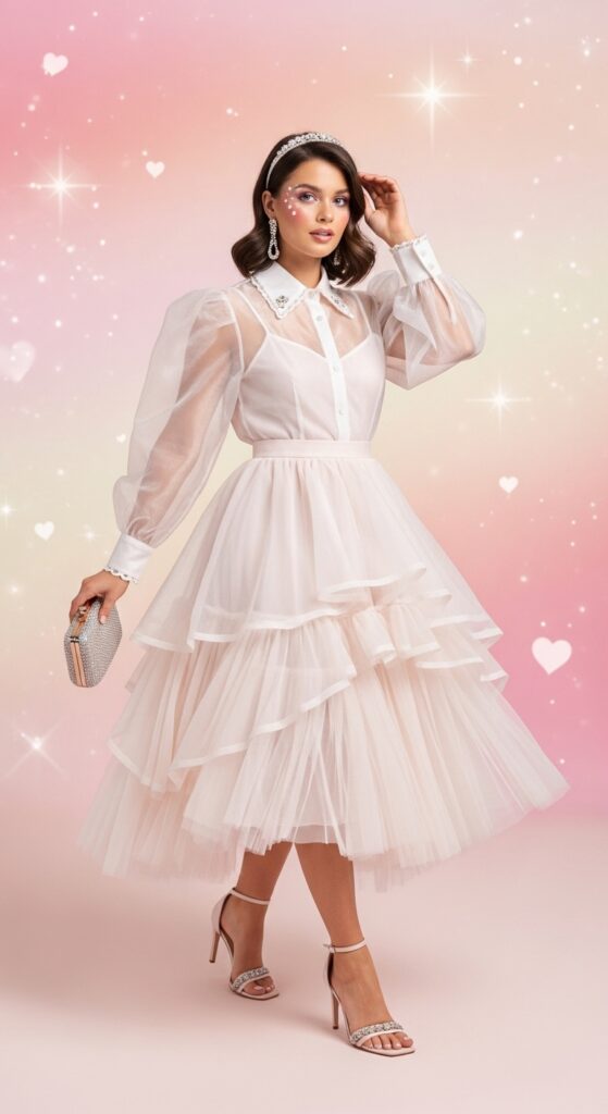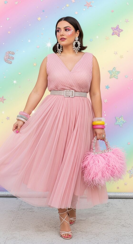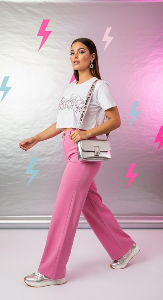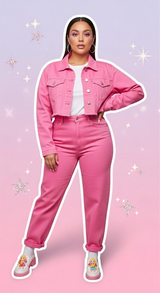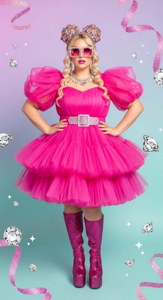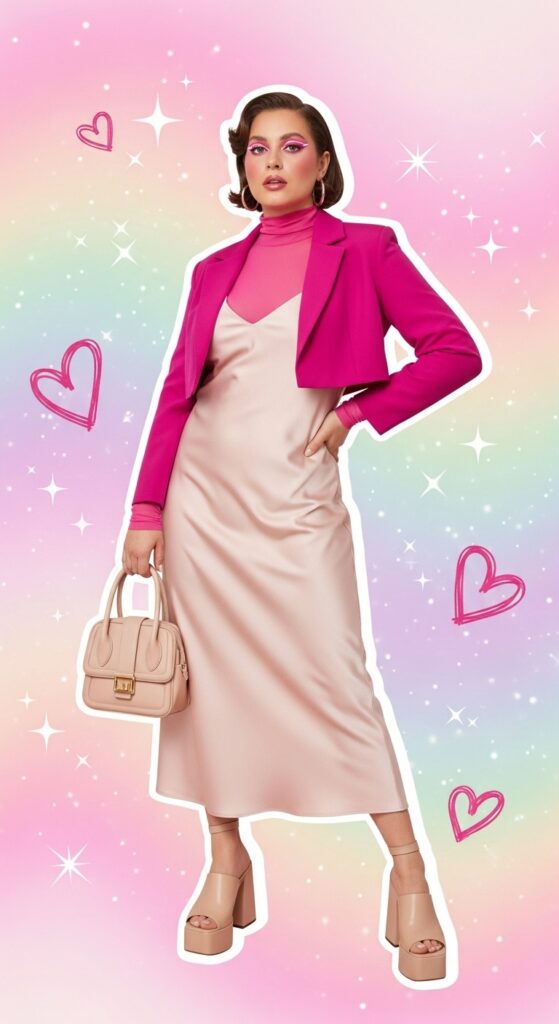 Maximalism is the spirit animal of Barbiecore, and nowhere is that more obvious than in the new “Living Dolls” trend. This look goes far beyond pink clothing, bringing surreal, oversized accessories into the mix—think candy-colored sunglasses, towering platform heels, bejeweled hair clips, and even sparkly gloves. It’s a cheerful riot of color and texture, with a wink to retro dollhouse fantasy.