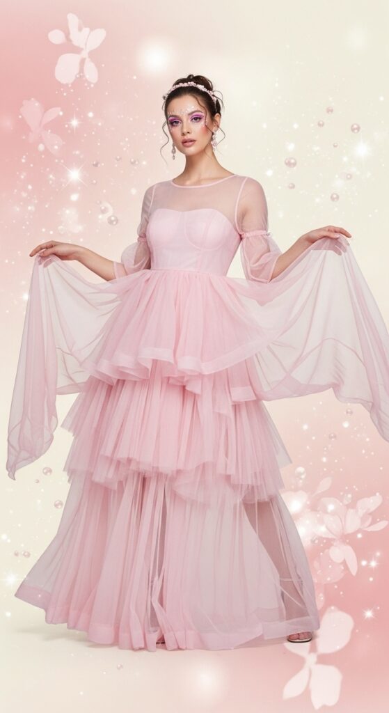 The final twist in this year’s Barbiecore story is all about softness. Ultra-sheer organza, chiffon, and airy tulles in whisper-pink shades have become a mainstay on recent runways. These fabrics float and move, catching the breeze and transforming the wearer into something both grounded and dreamy.