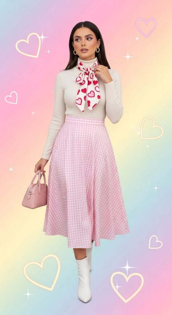 Prints are a Barbiecore favorite, but Ashley keeps them in check. She’ll wear a pink gingham skirt, a heart-print scarf, or a retro floral blouse—never all at once. The trick is letting just one printed piece take center stage while the rest of the look stays simple and grounded.