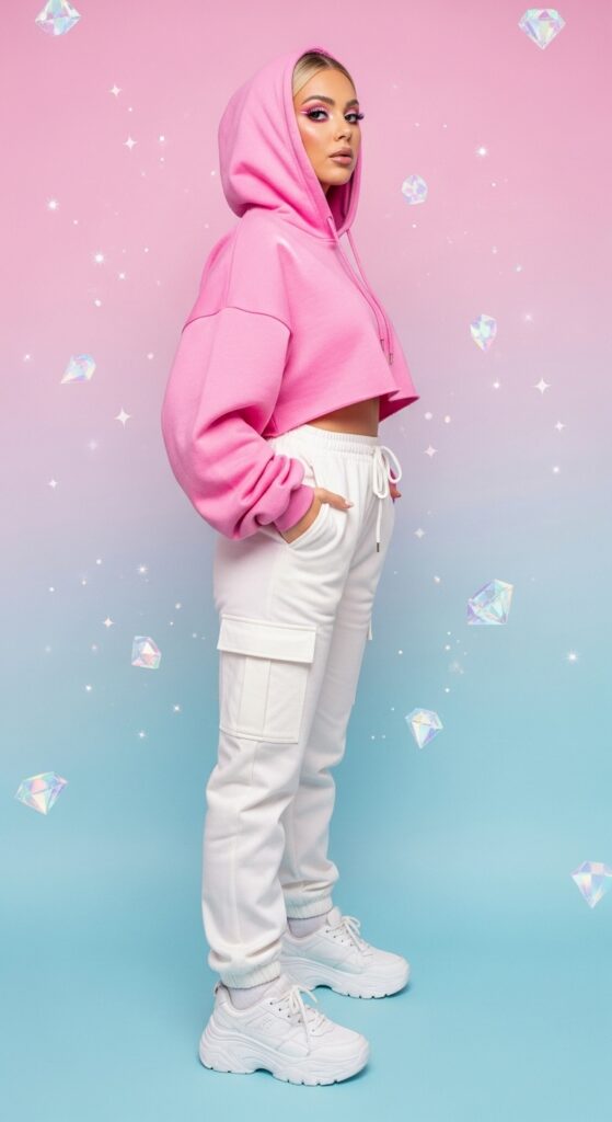 Barbiecore doesn’t have to be all dresses and frills. Ashley mixes girly pieces with sporty staples: a bubblegum hoodie with joggers, pink tanks with white sneakers, or even a mini dress with a denim jacket. This approach keeps her looks fresh and comfortable for any occasion.