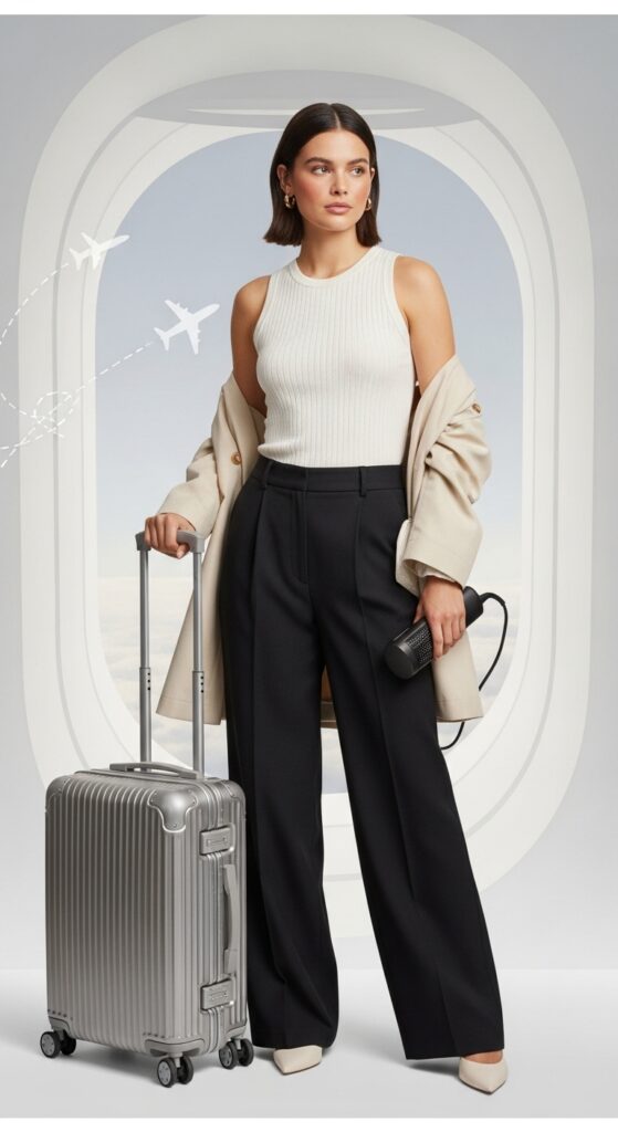 Neutral shades like cream, navy, and black blend seamlessly, so every piece works with the next. Just three blouses and two pairs of pants can cover a week’s worth of meetings and dinners. When I stopped bringing “just in case” items and started planning true capsules, mornings on the road became much less stressful.