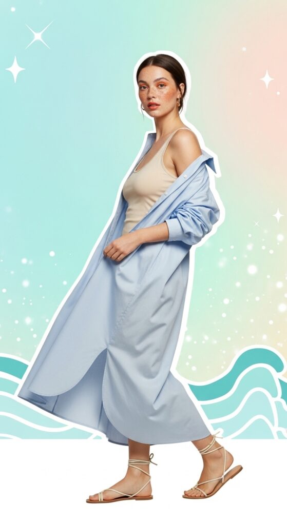 To add layers, drape a light cardigan or an oversized shirt over your shoulders. This extra piece adds dimension without taking away from the clean lines of the look. Neutrals such as beige, ivory, or muted olive keep the entire outfit cohesive and calming.