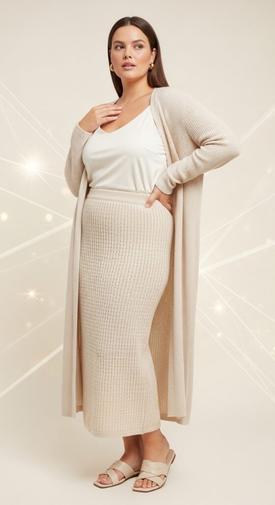 This look thrives in tonal shades like ivory, mocha, or soft charcoal. Matching textures create continuity, making the outfit feel expensive and put-together even if it is made from simple fabrics.