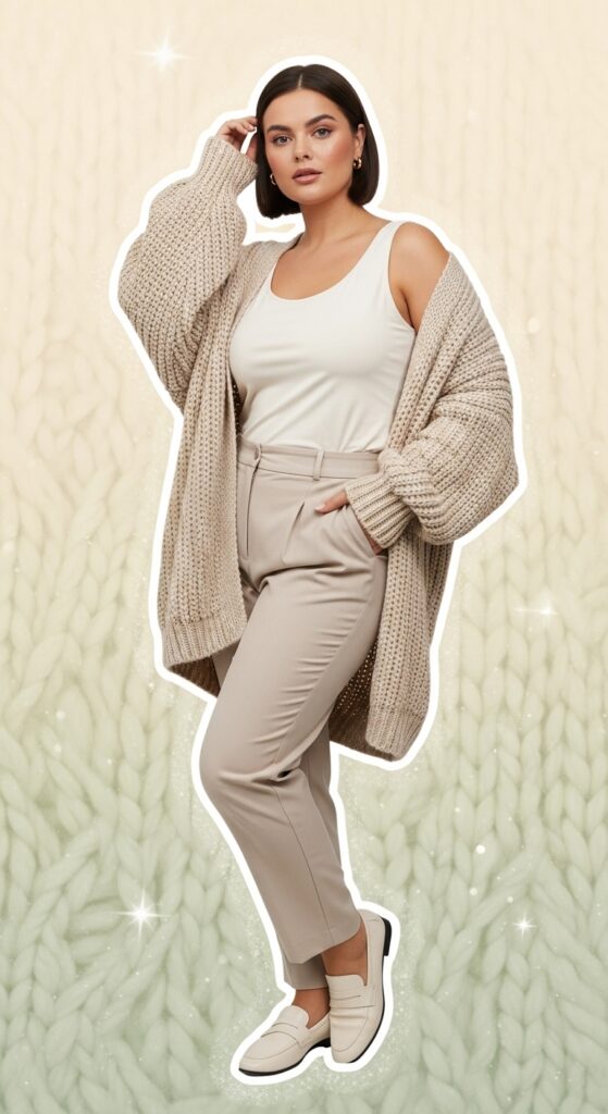 A tank layered under an oversized cardigan creates warmth without losing its minimal appeal. The mix of fitted and relaxed shapes makes the outfit visually interesting, while staying completely wearable.