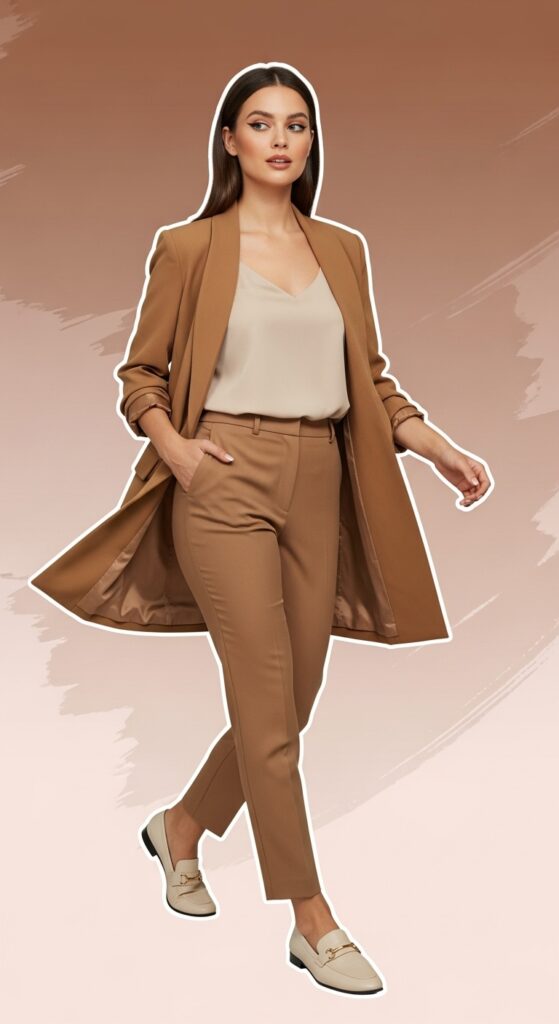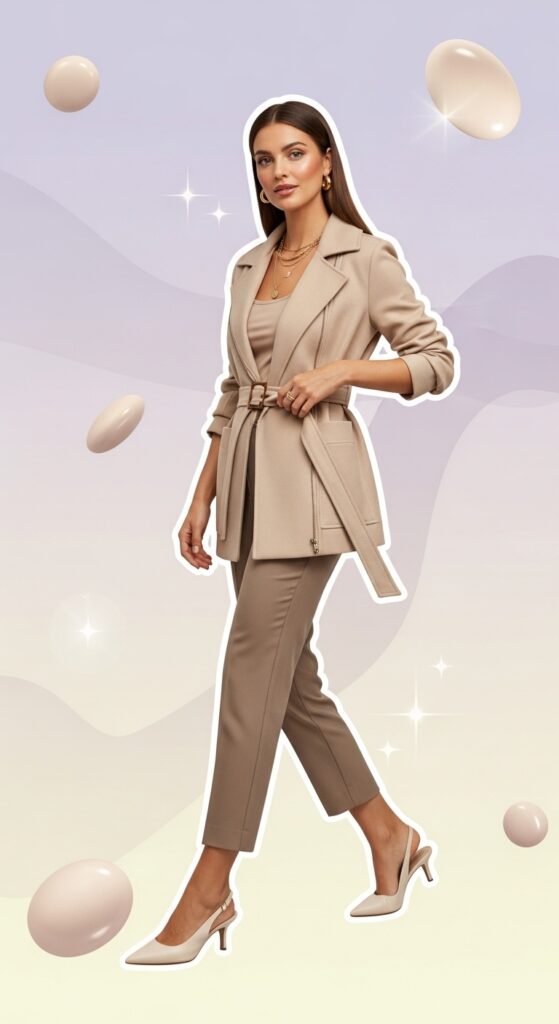Accessories should lean minimal: a structured bag, sleek loafers, and a slim belt. Each layer contributes without overwhelming, which makes the outfit elegant from every angle.