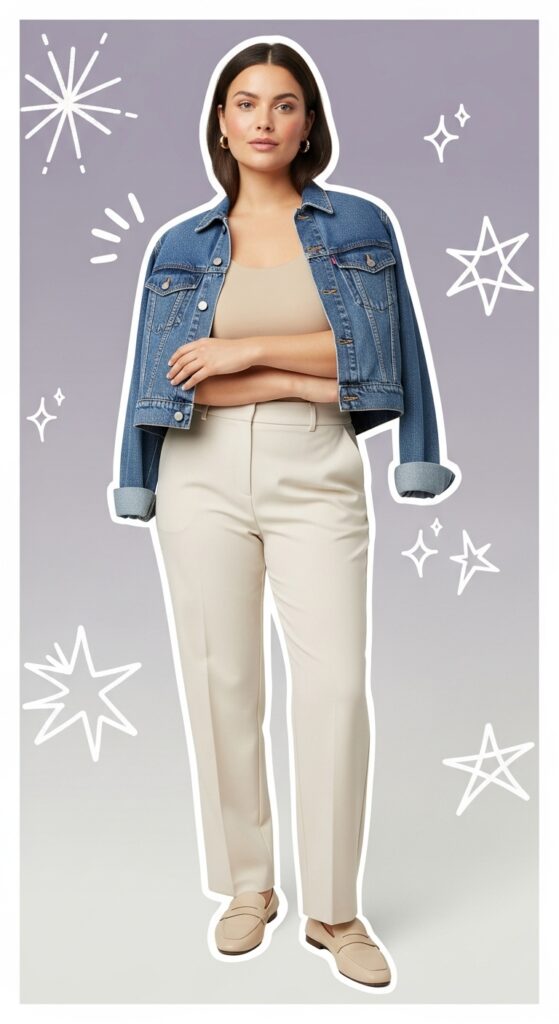 Opt for a washed, mid-tone denim that layers easily over white, cream, or beige tanks. Straight-leg trousers, tailored shorts, or wide-leg jeans balance the proportions beautifully.