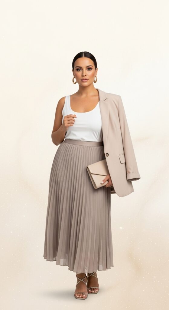 A neutral tank tucked into a pleated midi skirt offers fluidity and grace. The sharp pleats contrast against the clean simplicity of the tank, creating a balanced silhouette.
