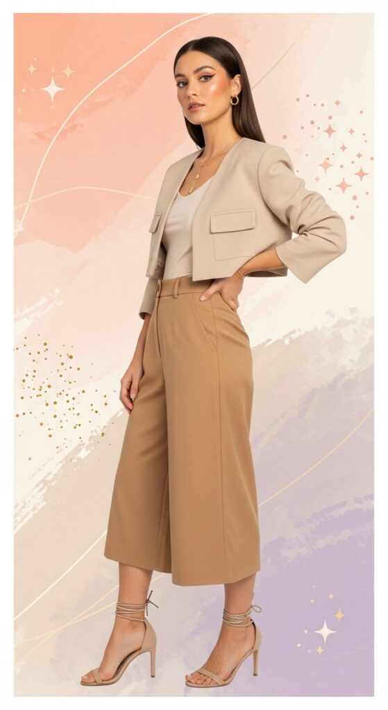 Pairing a tank with culottes creates a sculptural shape, which looks even better when layered with a cropped jacket. The jacket’s shorter cut emphasizes the waist and balances the volume of the culottes.