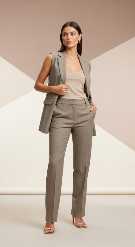 Choosing soft, muted shades like cream, camel, or charcoal creates harmony in the outfit. The absence of loud colors shifts the focus onto shape and proportion, which is exactly where minimalist fashion shines. If you prefer a softer aesthetic, you can leave the blazer unbuttoned to let the tank peek through casually.