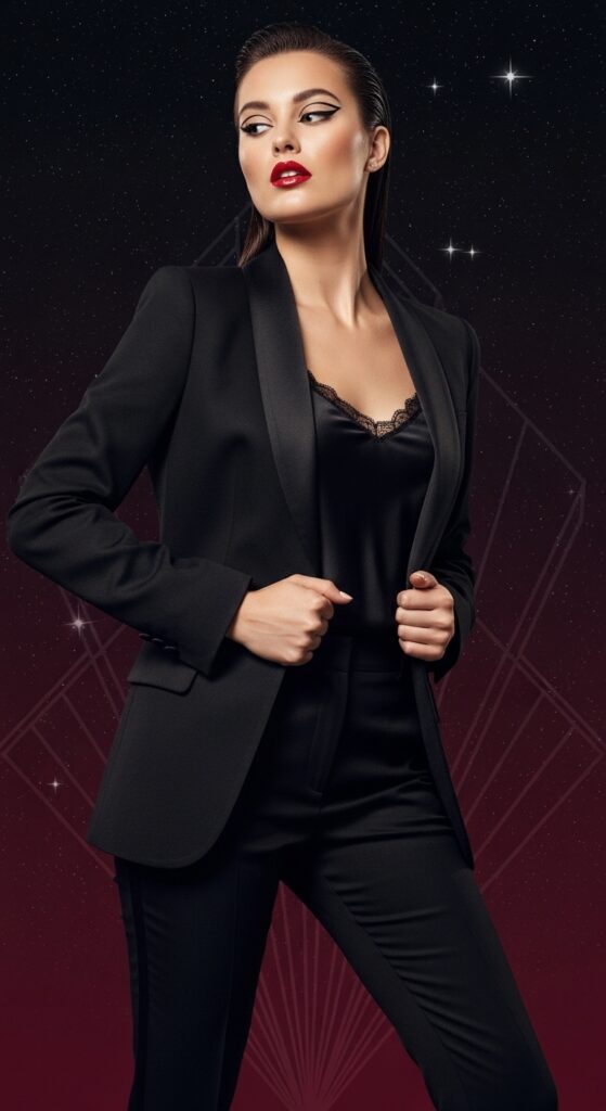For those who crave structure with a hint of daring, the tuxedo suit promises a memorable entrance. Pairing it with a silk camisole or letting bare skin peek out beneath the blazer’s lapel takes the look from formal to unforgettable.