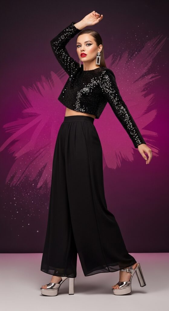 11. Sequined Black Crop Top + Wide‑Leg Trousers