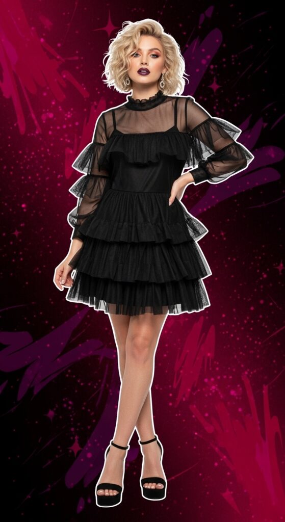 - Layering Tips: Sheer black tights or a feather-trimmed wrap can add texture.