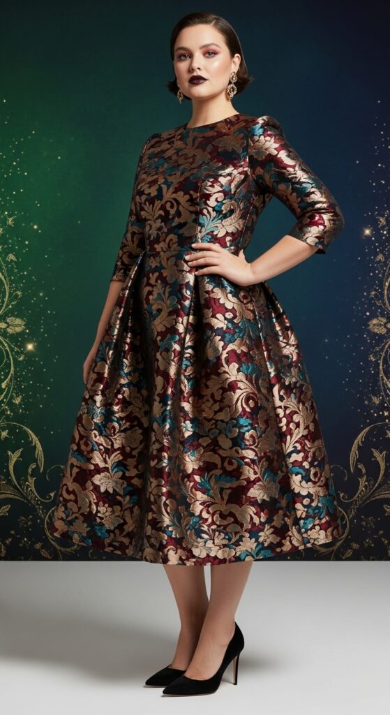 11. Brocade Midi Dress With Velvet Pumps
