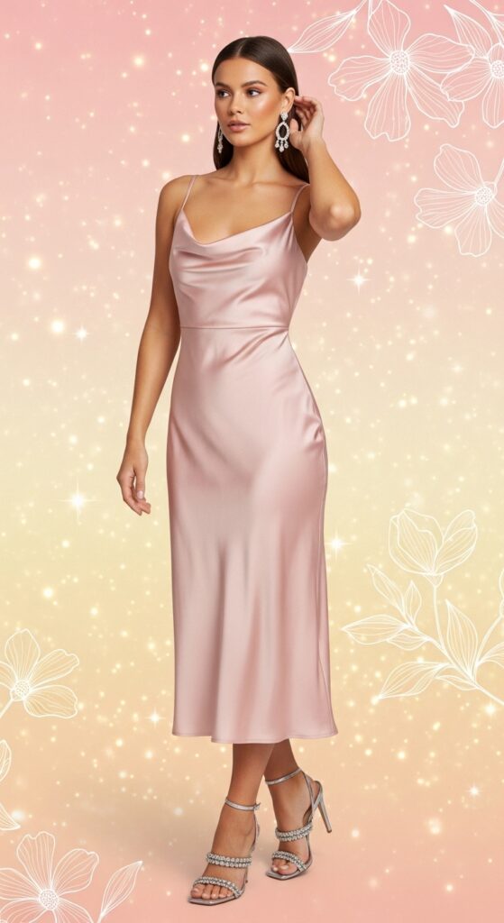Satin flows like water, shimmering with every turn, whispering luxury without ever shouting for attention. A midi dress in icy blue or soft blush, cinched gently at the waist, sets the stage for a night of celebration. Crystal-embellished heels add just enough sparkle, catching the light with each twirl or graceful stride. A simple diamond pendant or a pair of drop earrings completes the look, leaving you with just the right touch of elegance.