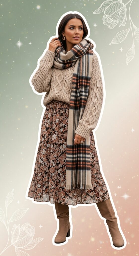 A chunky cable knit jumper layered over a flowing printed midi dress captures the essence of cozy femininity. Tall boots protect against the cold, while a plaid scarf around your neck keeps you bundled. Let the print peek out from beneath the sweater for extra visual interest.