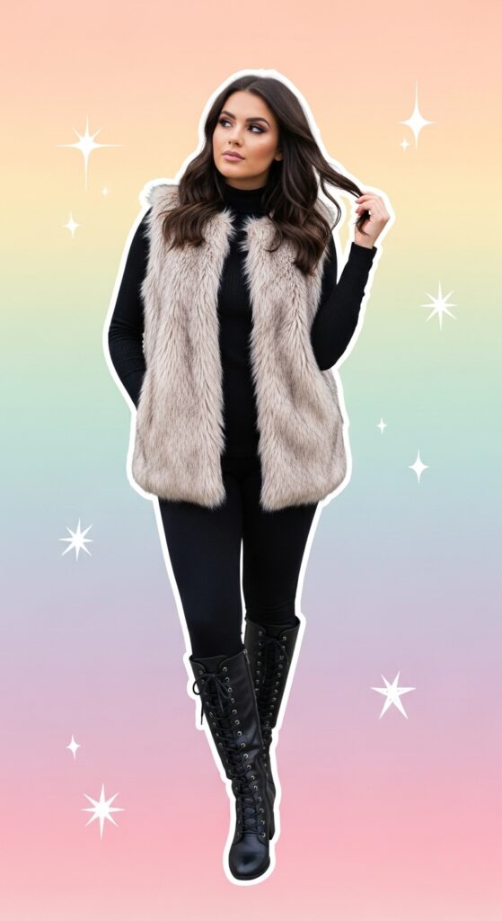 A faux fur vest adds instant texture and warmth without weighing you down. This piece stands out as playful and just a bit glamorous, perfect for those who like to stand apart from the crowd. Worn over a slim turtleneck and thermal leggings, the outfit strikes a balance between function and fun.