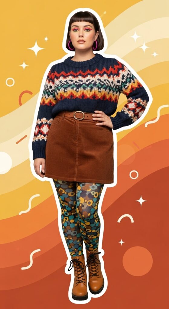A corduroy mini skirt paired with patterned tights brings playful nostalgia to the holiday season. Add a ribbed knit sweater for warmth, and lace-up boots for a bit of rugged contrast. A bright scarf adds a pop of color, making the look feel young and spirited.