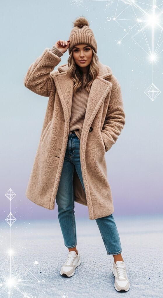 Pair your teddy coat with a classic ribbed beanie. White sneakers offer a sporty twist, while brown or taupe boots bring out the warmth of the coat. This outfit feels just as right for a dash across the square as it does for a long, leisurely market stroll.