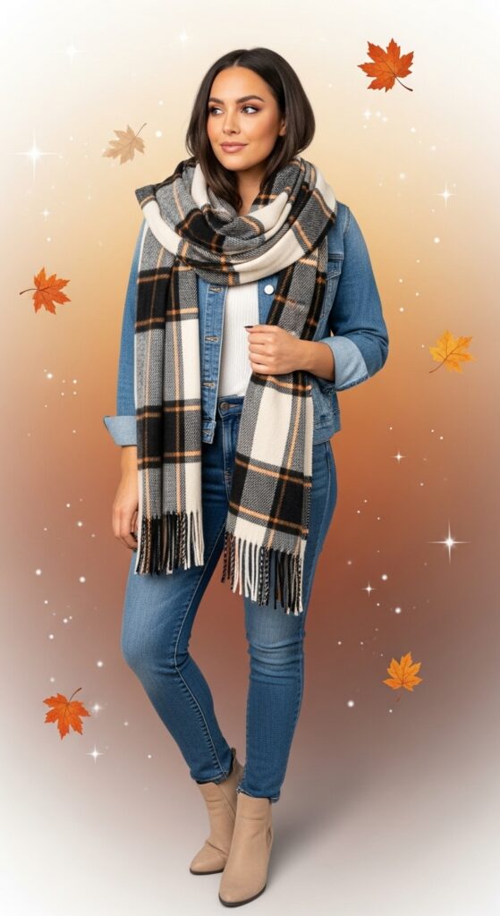 On milder afternoons, a denim jacket layered under a plaid blanket scarf offers an easygoing, flexible look that feels right at home at a festive market. The oversized scarf doubles as a shawl, which you can wrap close when a breeze picks up or let drape casually as you browse.