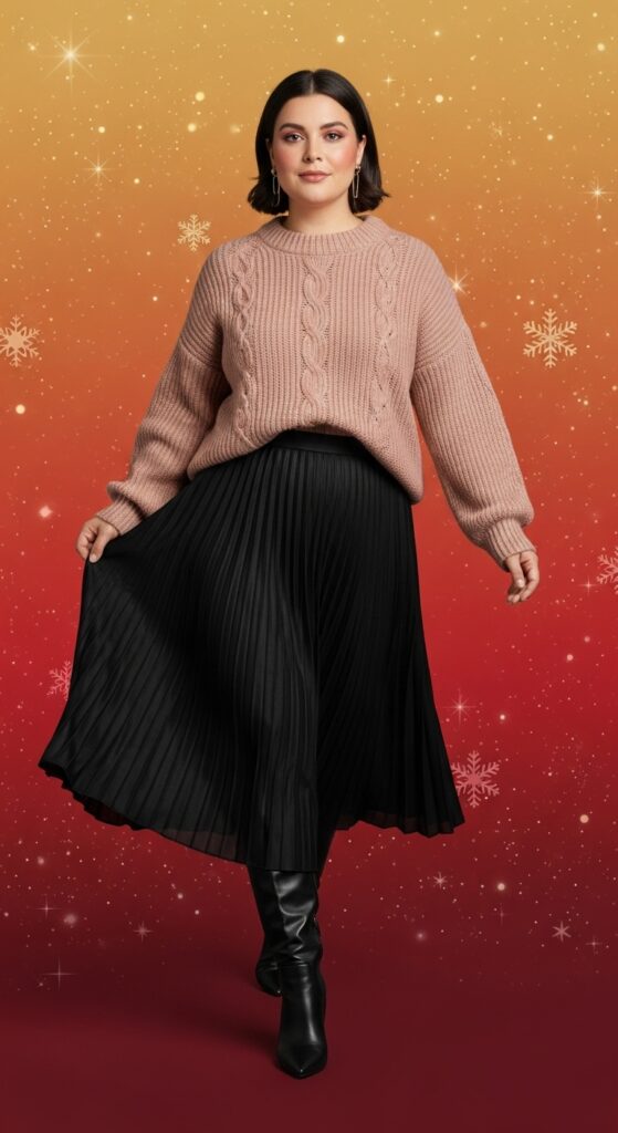 An oversized sweater paired with a midi skirt brings together comfort and femininity in a way that feels perfectly festive. A chunky knit, perhaps with a hint of sparkle or subtle print, looks lovely tucked into a softly pleated skirt. Opaque tights and weather-proof boots add warmth and style, making this outfit as practical as it is pretty.