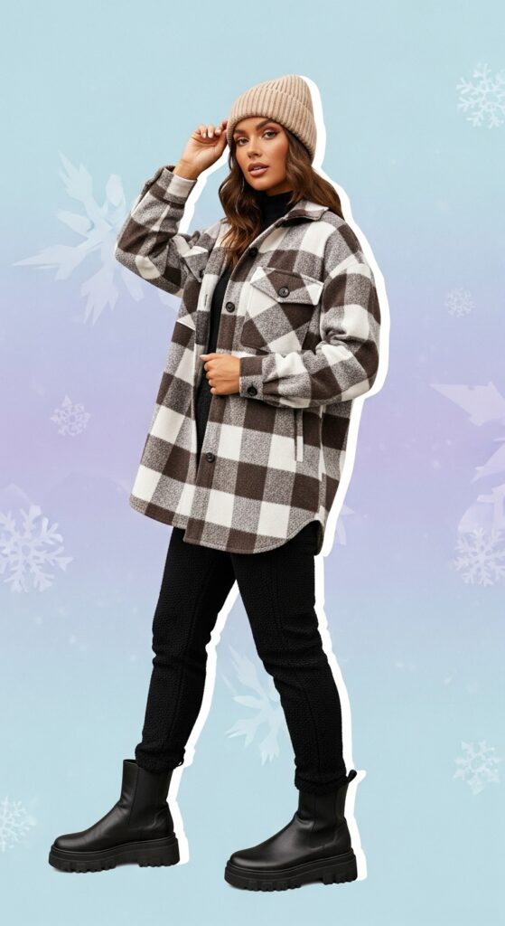 Fleece-lined leggings are an underappreciated secret for winter comfort. Pair them with a checked shacket—half shirt, half jacket—for an effortlessly cozy feel. Chunky boots and a beanie keep things casual but stylish, perfect for evenings around a firepit after the stalls have closed.