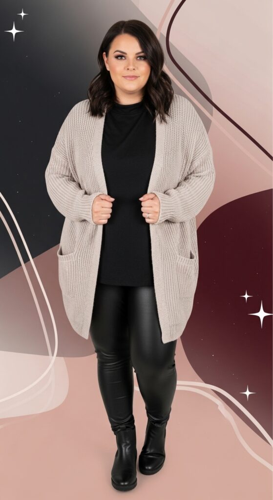Faux leather leggings bring a little edge to cold weather dressing, especially when paired with an oversized cardigan. Choose a cardigan in a pale, soft shade—cream, blush, or dove grey work beautifully. Chelsea boots keep things practical and stylish, while a small backpack lets you shop with ease.