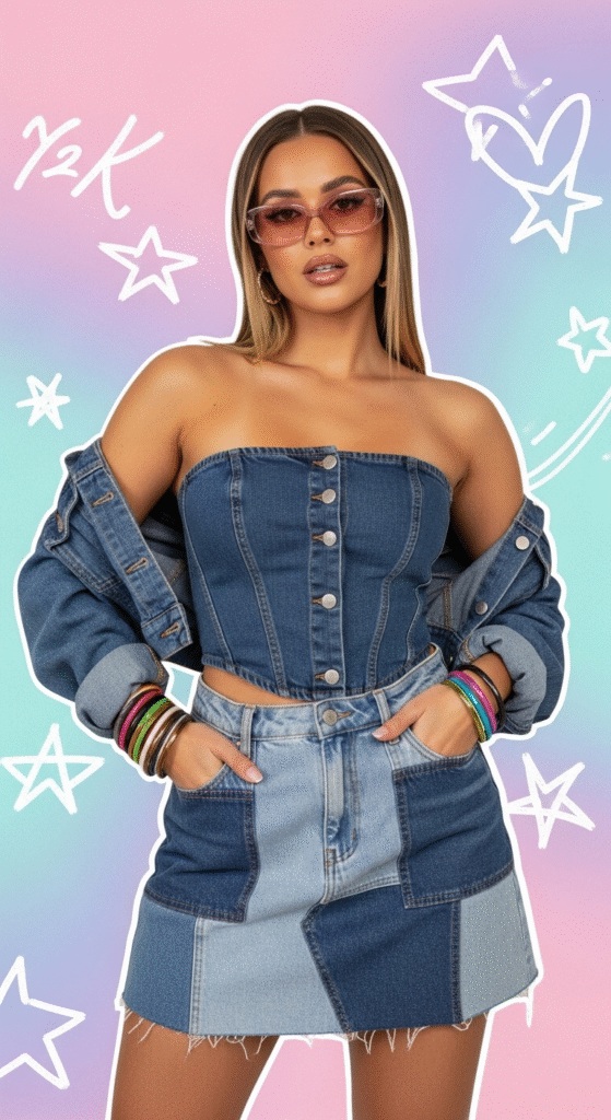 Denim has always played by its own rules, and the Y2K era celebrated matching sets without fear. Cropped denim jackets over low-rise jeans, or a mini skirt paired with a strapless denim corset—these combinations feel daring and rebellious. Throw in some colorful hair clips or a sparkly handbag for added fun. There’s no need to hold back, and that’s exactly what makes denim so exciting after dark.