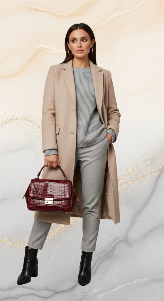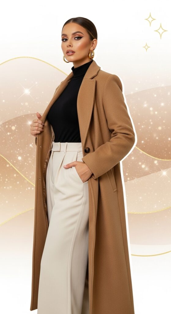 Few looks say polished like a long camel coat worn over a clean, monochrome base. Black turtlenecks, cream trousers, or off-white wide-leg jeans work beautifully under the soft, earthy warmth of camel wool. The effect feels grown-up without being dull, elegant without trying too hard. Add square-toe boots and gold hoop earrings to finish the look with quiet confidence.