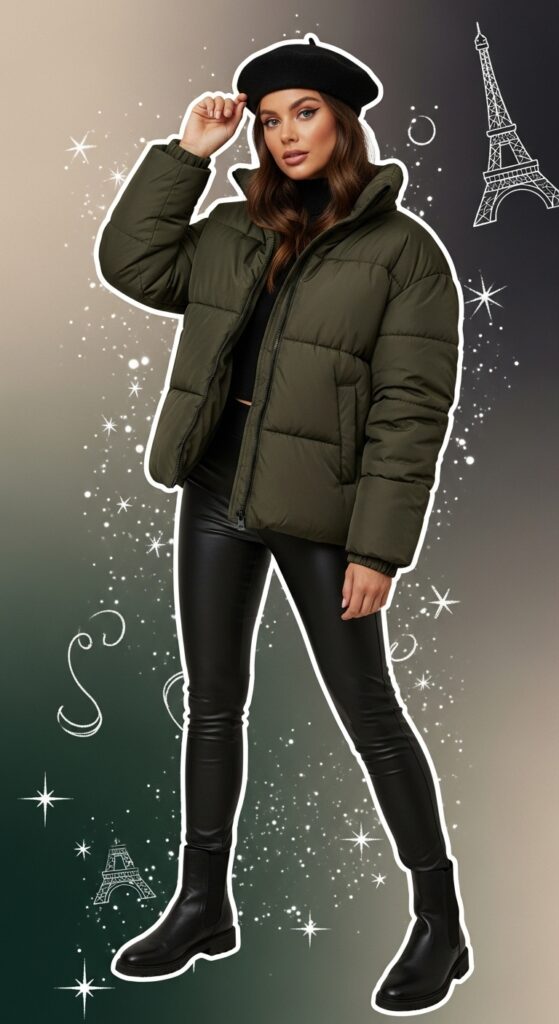 The chunky puffer—especially in olive green or matte black—offers warmth without weighing down the outfit’s shape. Pairing it with sleek trousers or leather leggings adds contrast, while a beret brings in a Parisian twist that softens the athletic edge. This is a look seen on Lower East Side sidewalks and café corners in Montmartre alike. It’s easy, city-smart, and undeniably cool.