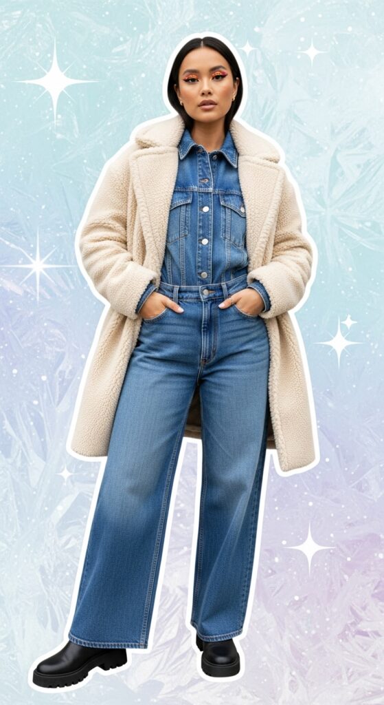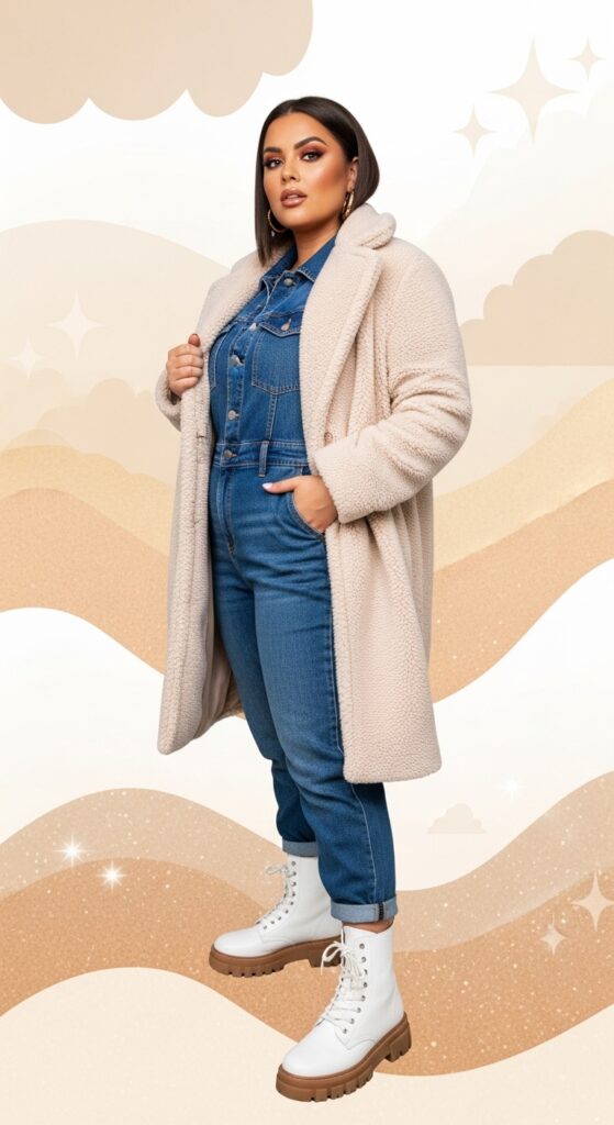 The soft texture of a teddy coat adds warmth and playfulness to the sharp utility of a denim jumpsuit. The contrast feels both nostalgic and fresh, with a silhouette that manages to be cozy without being bulky. Whether paired with combat boots or white sneakers, this combination makes a laid-back statement with serious charm.