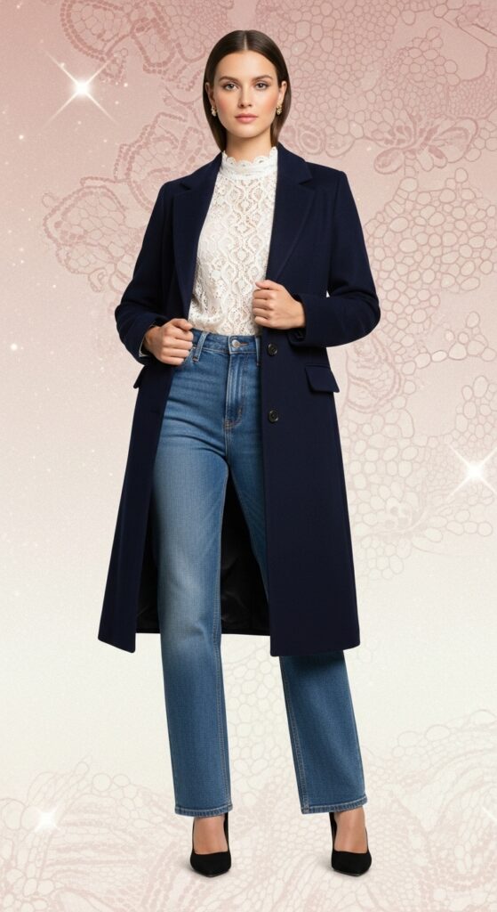 Delicate lace details peeking from under a coat add a quiet sensuality to winter dressing. A high-neck lace blouse under a structured coat pairs just as well with classic trousers as it does with vintage-wash denim. The look toes the line between romantic and tailored. Add loafers or kitten heels, and a leather clutch if heading out for the evening.