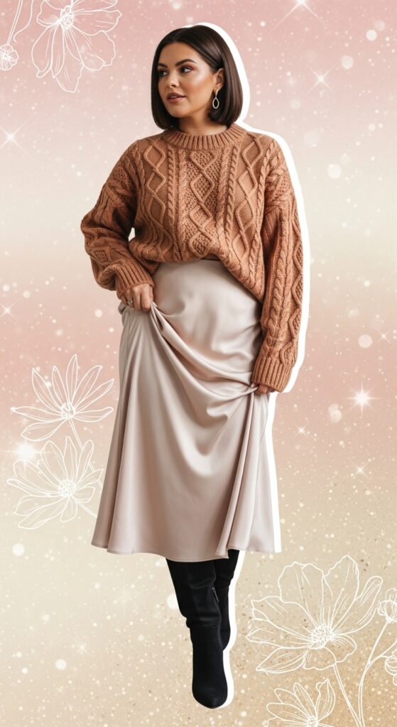 A satin slip skirt moves with a kind of whisper, and when anchored by a thick cable-knit sweater, it becomes winter-ready without losing its grace. The textures contrast, the proportions balance. Whether worn with tall boots or sneakers, it feels romantic and grounded at the same time. Add a wool coat for an elegant outer layer.