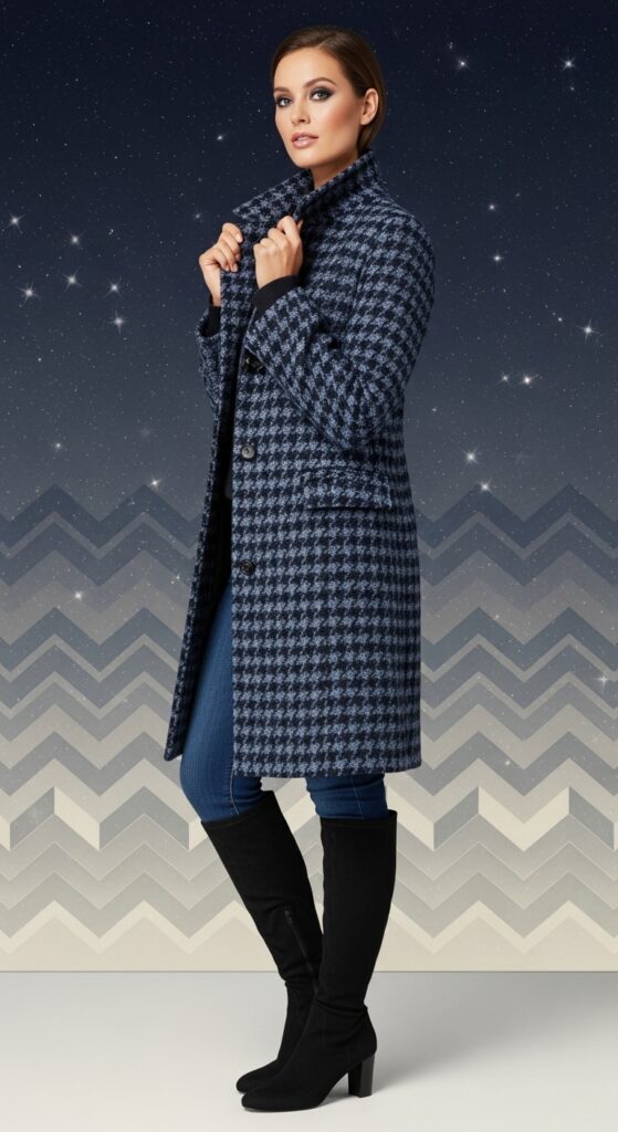 Structure creates elegance, even on the coldest days. A sharply tailored wool coat in navy, charcoal, or houndstooth pattern frames the body and polishes up casual staples. Skinny jeans tuck neatly into knee-high boots or sock boots, giving a long, lean silhouette. It’s the kind of outfit that makes walking down the street feel cinematic.