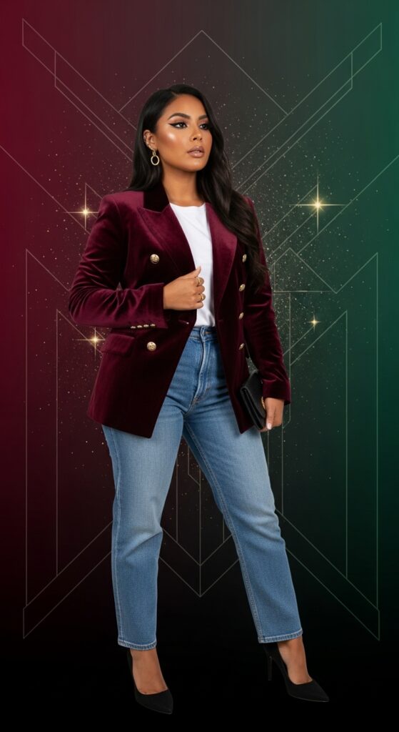 Velvet blazers bring a richness that cotton or wool can’t match. A black, burgundy, or emerald velvet blazer with gold buttons over a white tee or turtleneck adds vintage allure to even the simplest outfit. Wear it with straight-leg jeans or pleated trousers and ankle boots. The finish is subtle luxury, perfect for a cold evening out.