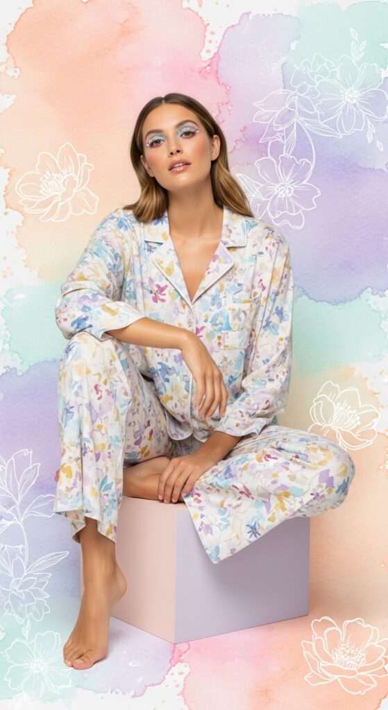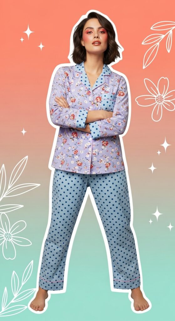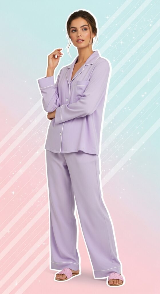 The classic pajama shape—button-up top and matching pants—gets a fresh twist with lively colors and piped edges. I love starting my mornings in this set, sipping tea and planning the day ahead. The pieces look just as cute mixed with solid basics for quick trips outside.