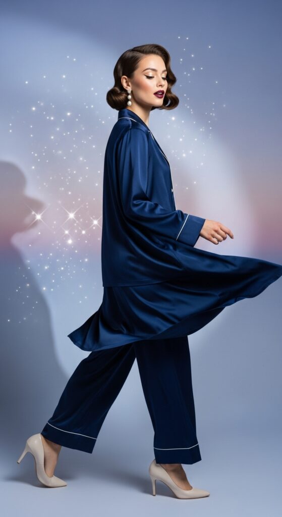 I reach for this set on nights when I want to indulge in a little self-care—mask on, hair in a towel, and soft music in the background. The relaxed fit feels breezy without looking sloppy, while the slight sheen catches the light in the most flattering way. Even in the depths of winter, pairing the set with a cozy cardigan creates a sense of quiet opulence.