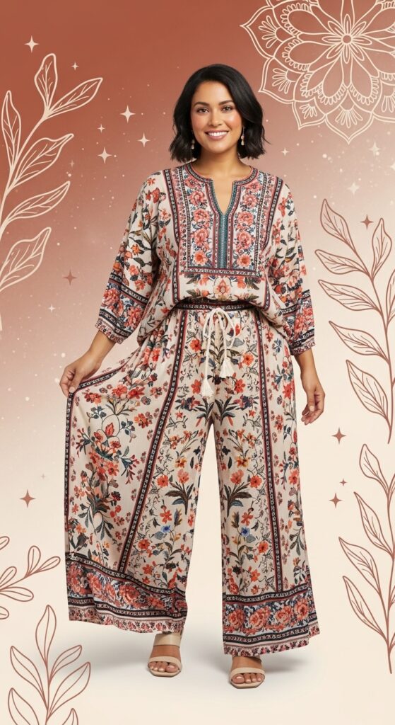The fit is relaxed without being baggy, and the wide-legged pants offer a gentle sway as you walk. I love wearing this set on days when the outside world feels dull; the vibrant prints never fail to spark creativity and good vibes. Soft, breathable cotton ensures all-day comfort.