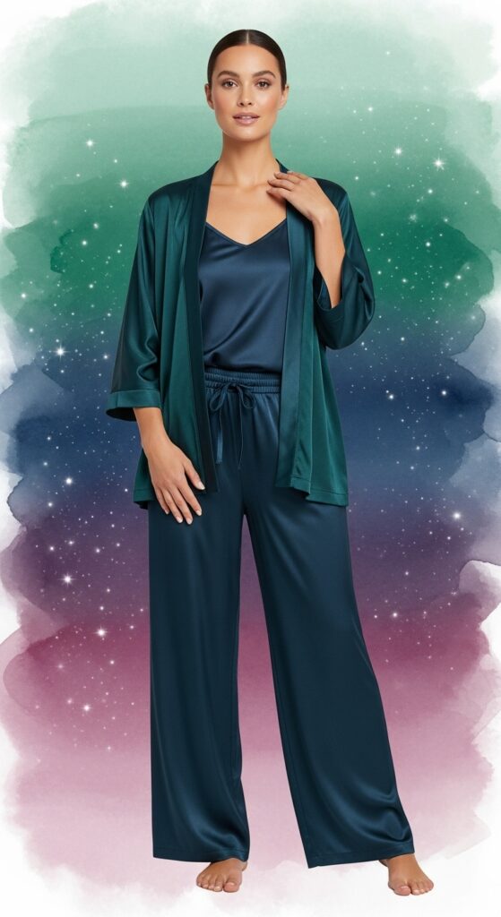Color options run from classic neutrals to rich jewel tones, inviting you to choose your mood for the evening. There’s a confidence that comes from lounging in silk, even if the only one who notices is you. When I want to signal to myself that it’s time to unwind, this set is my secret ritual.