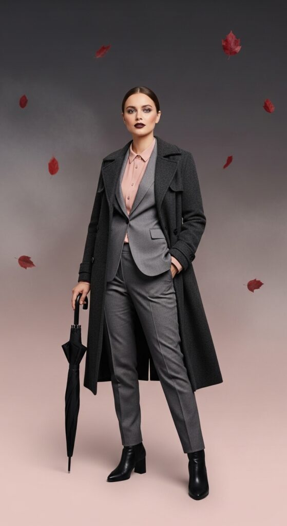 A dark gray trench or suit feels sophisticated yet approachable. Try mixing with soft blush or pale blue for a gentle contrast.