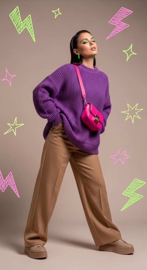 Pick a single statement piece—a neon sweater, bright purple bag, or bold earrings—and let it shine against a neutral background.