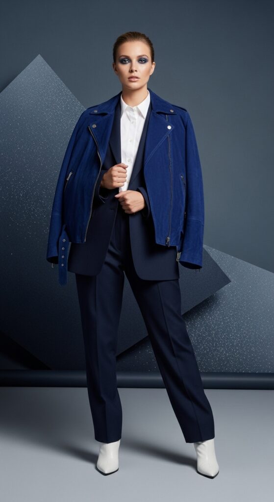 Wear navy as a base layer—trousers, blazers, or even a suede skirt. Pair it with crisp white for contrast or soft pastels for a more romantic take.