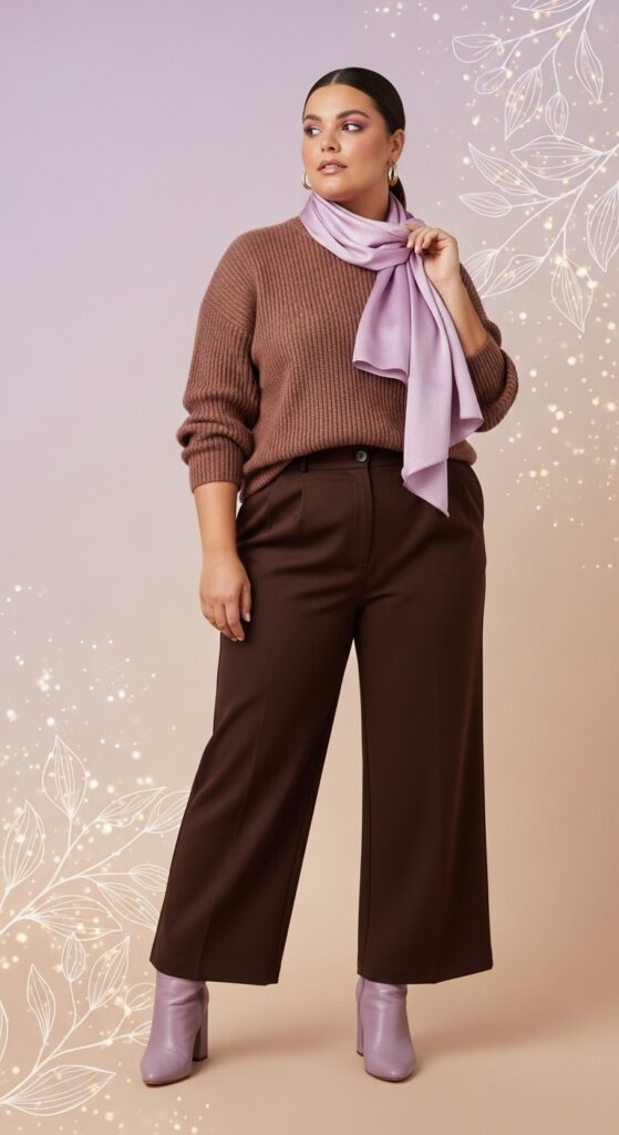 Wear a lilac blouse tucked into chocolate trousers, or try a brown knit with a lilac scarf draped over your shoulders. Even lilac boots under a chocolate midi skirt can look just right.