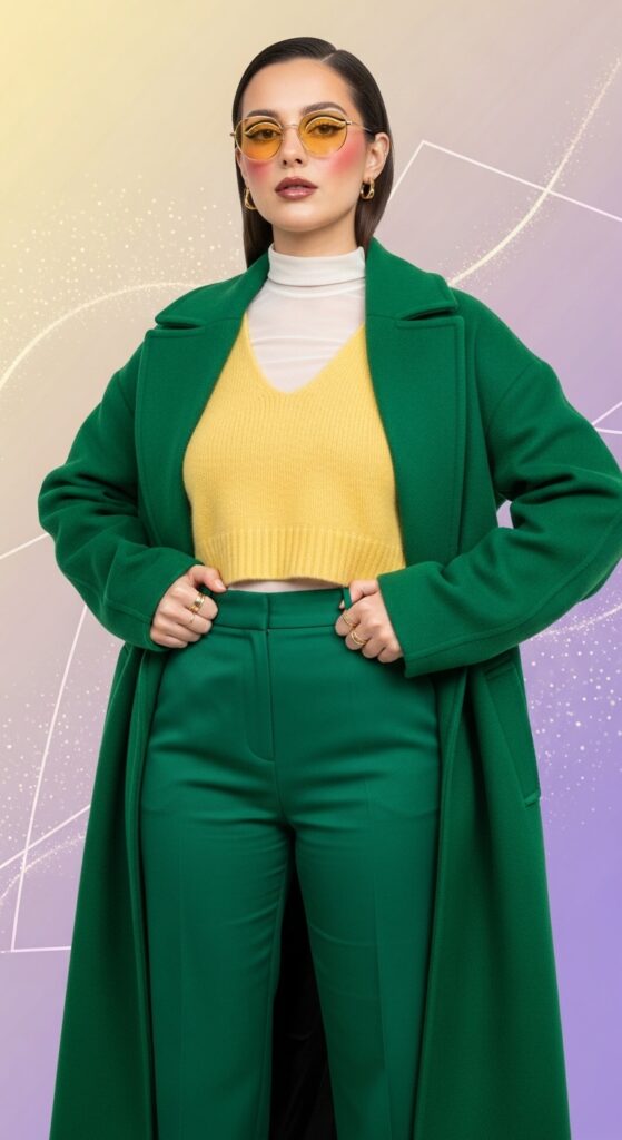 Try a yellow sweater layered under a camel coat, or yellow loafers with dark jeans. For a bold mood, a statement coat in this shade brightens the cloudiest day.