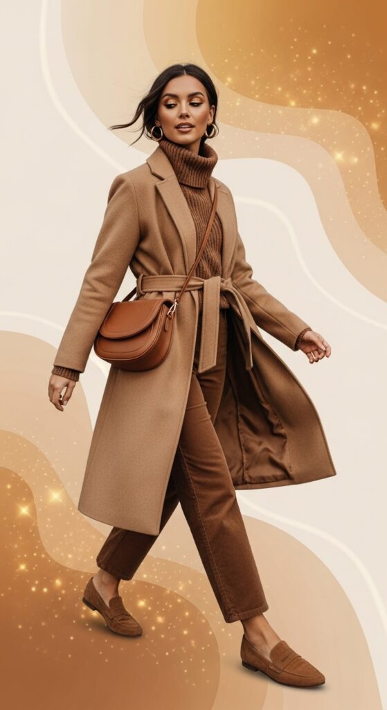 If you’re cautious about brown, start with accessories—a leather belt, a cozy beanie, or even brown-framed sunglasses. For a modern touch, pair Mocha Mousse with unexpected pops of lilac or pale blue.