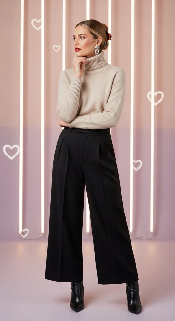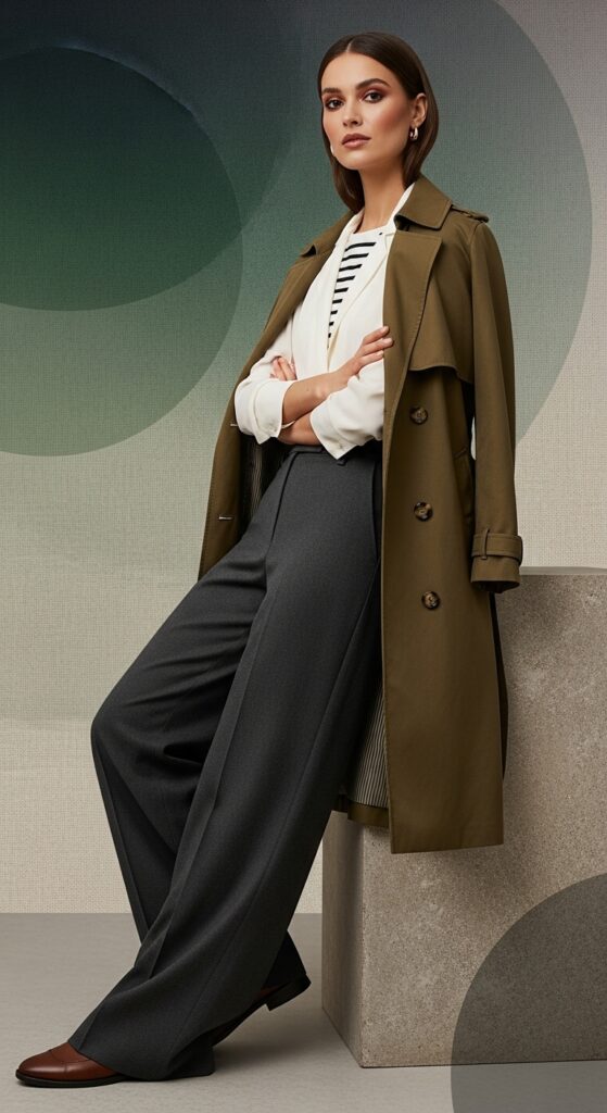 - Wide-leg trousers + fitted turtleneck + trench coat: Effortlessly polished.