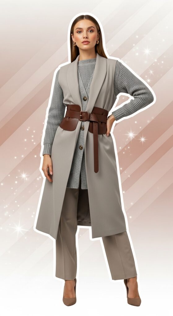 A belt is more than an accessory—it’s an instant way to restore shape and definition when layers start to blur your silhouette. Sometimes I’ll add a soft leather belt over a cardigan and watch the whole outfit pull together. Belting a blazer or a long vest can highlight the waist, breaking up straight lines and creating a polished finish.
