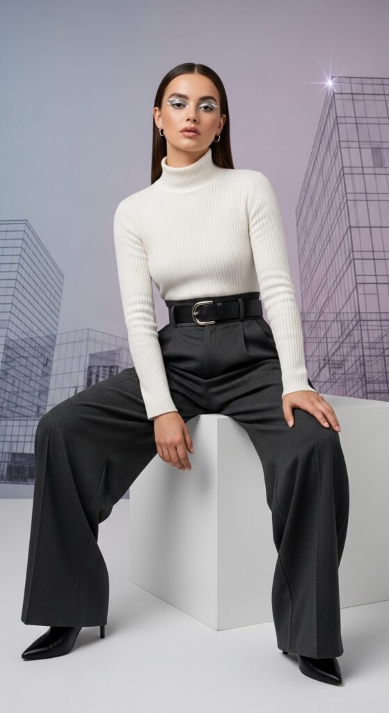 A fitted turtleneck tucked into the pants creates a sleek, balanced look. This combination is ideal for transitional weather, offering warmth without bulk. It’s a reliable choice for creative professionals who need both comfort and authority.