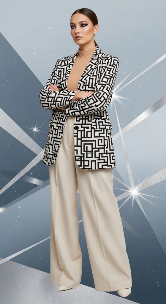 A patterned blazer is a secret weapon for livening up simple work outfits. Whether featuring plaid, floral, or geometric motifs, a blazer becomes the focal point when paired with a white tee or a sleek black turtleneck. This balance keeps the look intentional and professional.