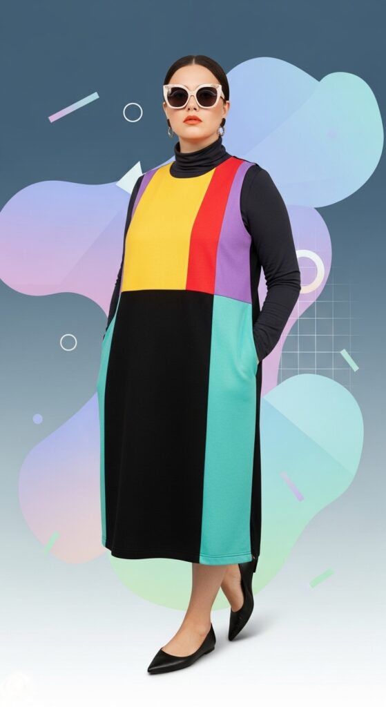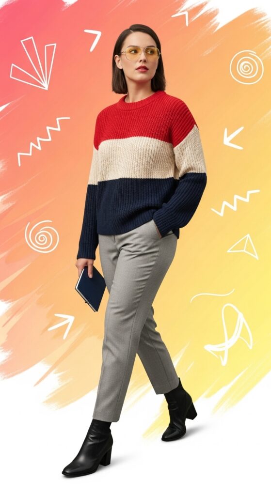 A color-blocked sweater brings playful energy to tailored trousers. Bold sections of color draw the eye, making this outfit a standout for creative environments. Keeping the trousers classic—think slim-cut, ankle-length styles—grounds the look.