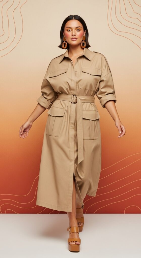 A utility shirt dress in olive, sand, or navy is practical yet undeniably stylish. Oversized pockets and a belted waist combine function and fashion, creating a look that’s both relaxed and intentional.